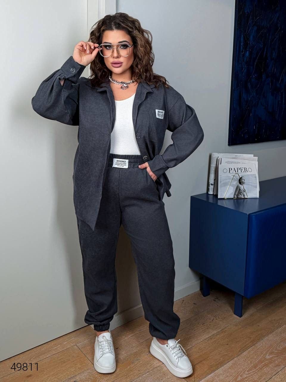 54-56: ОГ: 130 см, длина рубашки: 78 см, рукав: 56 см, ОБ: 130 см, длина брюк: 110 см, талия тянется до 120 см.