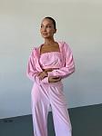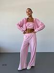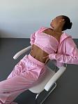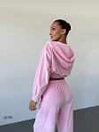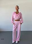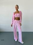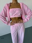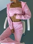 Костюм-тройка женский. Кофта, топ и брюки. Кофта застегивается на молнию, с двойным капюшоном. Брюки на резинке, есть карманы. Топ-бандо на резинках.