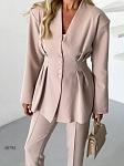 Костюм брючный женский. Пиджак с подплечниками, застегивается на пуговицы. Брюки застегиваются на пуговицу и молнию, сзади на резинке, есть карманы.