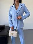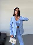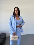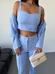 Костюм-тройка женский. Пиджак с подплечниками, застегивается на пуговицу, штаны сзади на резинке, застегиваются на пуговицу и молнию, есть карманы. Топ сзади застегивается на молнию.