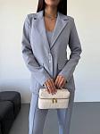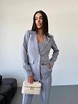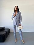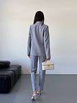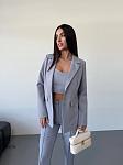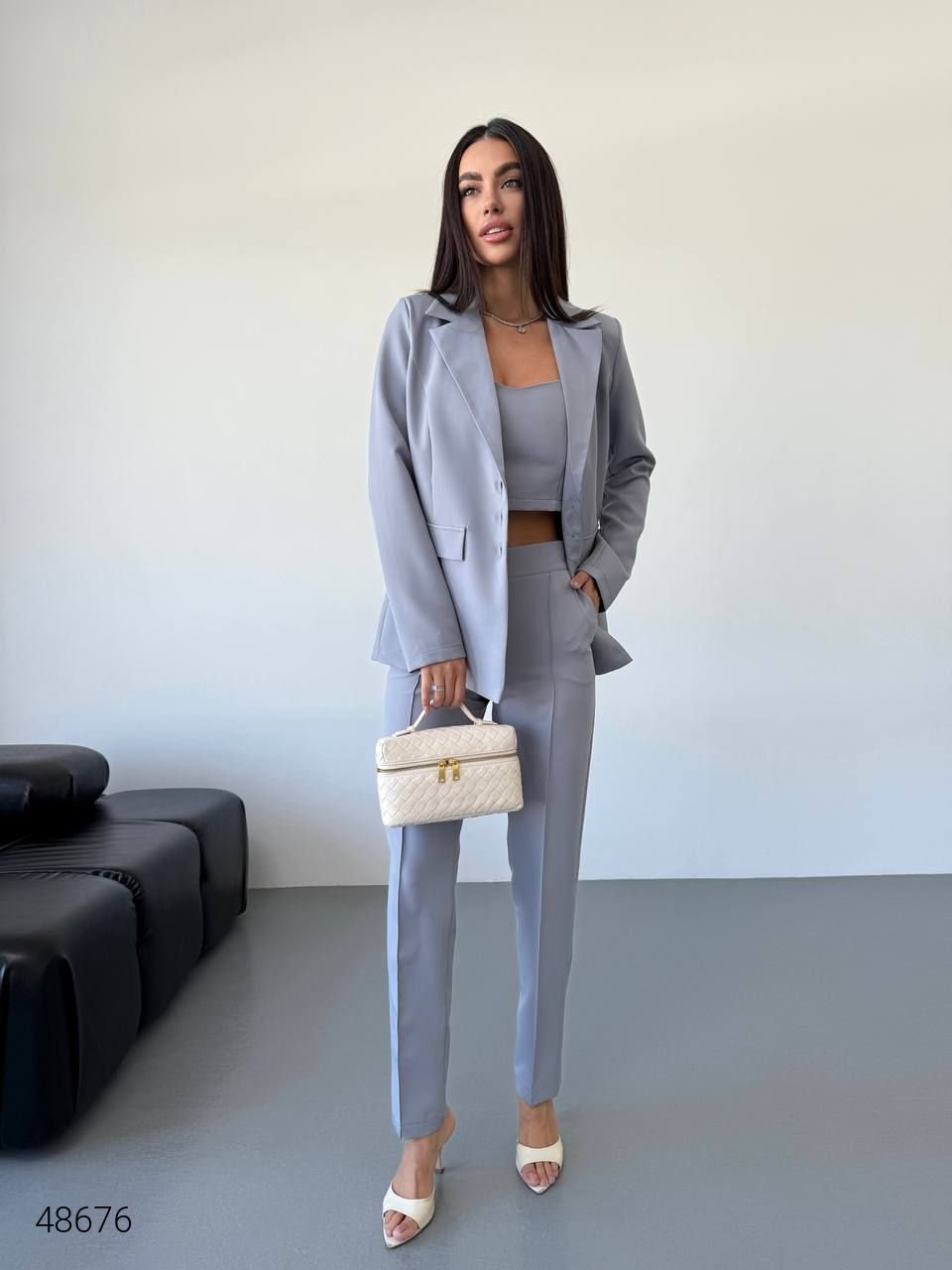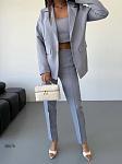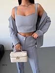Костюм-тройка женский. Пиджак с подплечниками, застегивается на пуговицу, штаны сзади на резинке, застегиваются на пуговицу и молнию, есть карманы. Топ сзади застегивается на молнию.