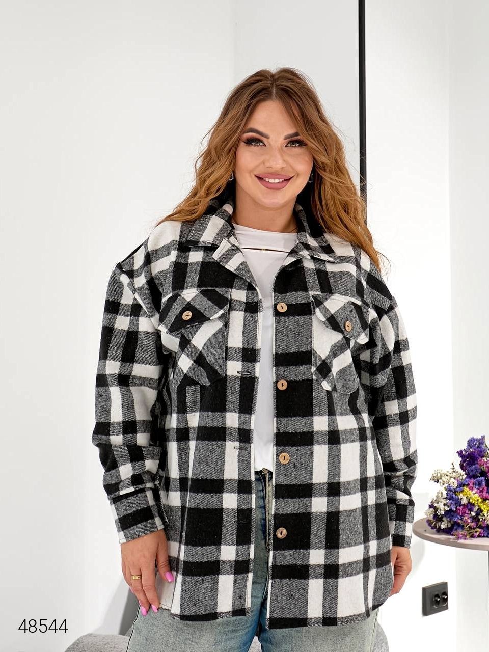 Рубашка женская кашемировая в клетку. Застегивается на пуговицы, имеет накладные карманы.
