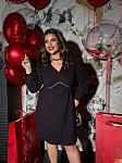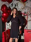 Коктейльное платье с акцентным декольте. Модель имеет свободный силуэт, длинные рукава и изящный вырез. Главный акцент — кант с камнями, мягко подчеркивающий линию груди.