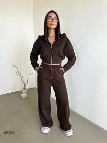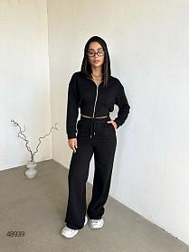 Костюм жіночий трикотажний. Дуже стильний у цьому сезоні костюм (скорочений світшот на блискавці та широкі брюки). Кофта на блискавці з капюшоном. Брюки на резинці,по бокам кишені, зі шнурками. Тканина: якісний турецький футер петля.