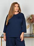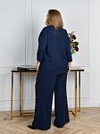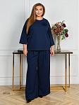 Костюм жіночий. Туніка вільного прямого силуету, виріз горловини круглий, рукав 3/4. Низ асиметричний, з невеликими розрізами. Туніку декоровано трояндою із основної тканини (за потреби можна зняти). Кишень та застібок немає. Брюки-палаццо з защипами по лінії талії, в бічних швах оброблені кишені, на резинці.