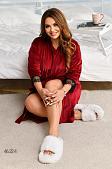 Домашній комплект. Халат + сукня. Халат виконано на запах, по талії фіксується поясом. Попереду, праворуч накладна кишеня. Рукави декоровано дуже гарним мереживом. Сукня прямого вільного силуету, горловина кругла, кишень, застібок немає.