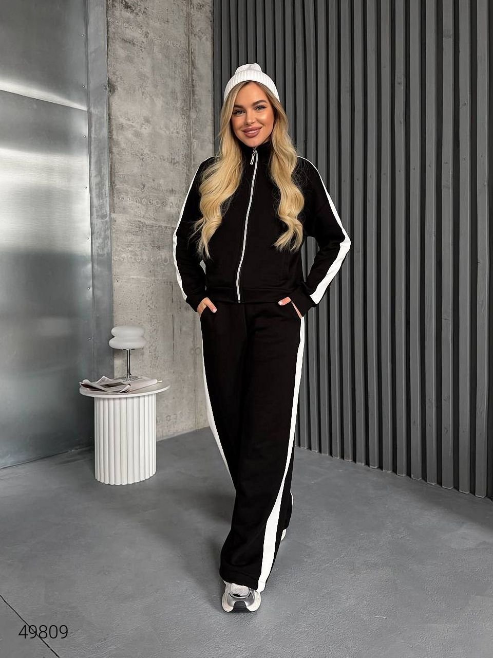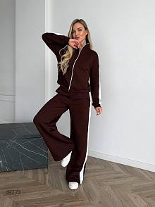 Костюм жіночий з лампасами. Кофта з кишенями, застібається на блискавку. Штани вільного крою, пояс на гнучкій резинці, з кишенями.Тканина: турецька петля футер.Розміри: 42 (S), 46 (L), 50 (2XL), 52 (3XL)Заміри: 42 (S)Світшот: ОГ: 82-105 см. ОТ: 62-85 см. Д. рукава по внутрішньому шву: 38 см. Д. виробу по спинці: 55 см.Брюки: ОТ: 62-85 см. ОБ: 90-105 см. Д. виробу по шаговому шву: 80 см. Д виробу по боковому шву: 110 см.46 (L) Світшот: ОГ: 90-113 см, ОТ: 70-94 см. Д. рукава по внутрішньому шву: 38 см. Д. виробу по спинці: 56 см.Брюки: ОТ: 70-93 см. ОБ: 98-113 см. Д. виробу по шаговому шву: 80 см. Д. виробу по боковому шву: 110 см. 50 (2XL)Світшот: ОГ: 98-121 см. ОТ: 78-102 см. Д. рукава по внутрішньому шву: 38 см. Д. виробу по спинці: 57 см. Брюки: ОТ: 78-101 см. ОБ: 106-121 см. Д. виробу по шаговому шву: 80 см. Д. виробу по боковому шву: 110 см. 52 (3XL)Світшот: ОГ: 102-125 см. ОТ: 82-106 см. Д. виробу по спинці: 57 см. Д. рукава по внутрішньомушву: 38 см. Брюки: ОТ: 82-105 см. ОБ: 110-125 см. Д. виробу по боковому шву: 80 см. Д. виробу по шаговому шву: 110 см.