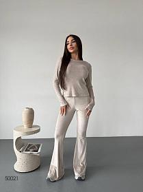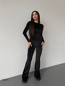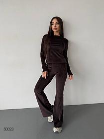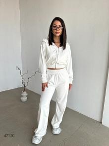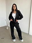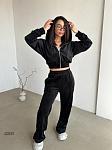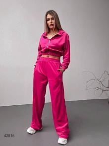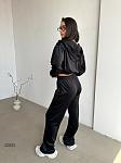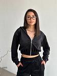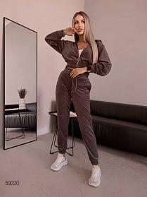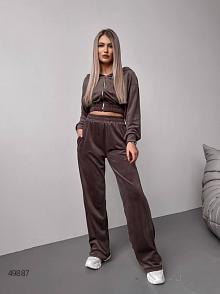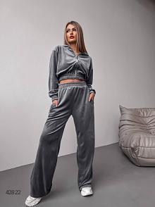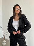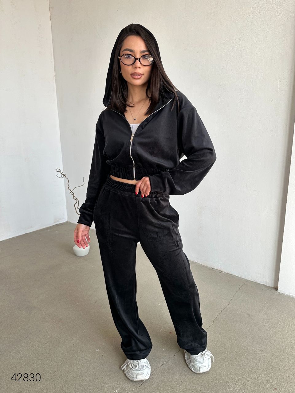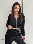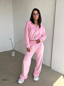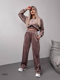 Костюм велюровий жіночий. Кофта та штани. Кофта з капюшоном з декоративною блискавкою, пояс на простроченій гумці. Штани з кишенями.