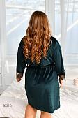 Домашній комплект. Халат + сукня. Халат виконано на запах, по талії фіксується поясом. Попереду, праворуч накладна кишеня. Рукави декоровано дуже гарним мереживом. Сукня прямого вільного силуету, горловина кругла, кишень, застібок немає.
